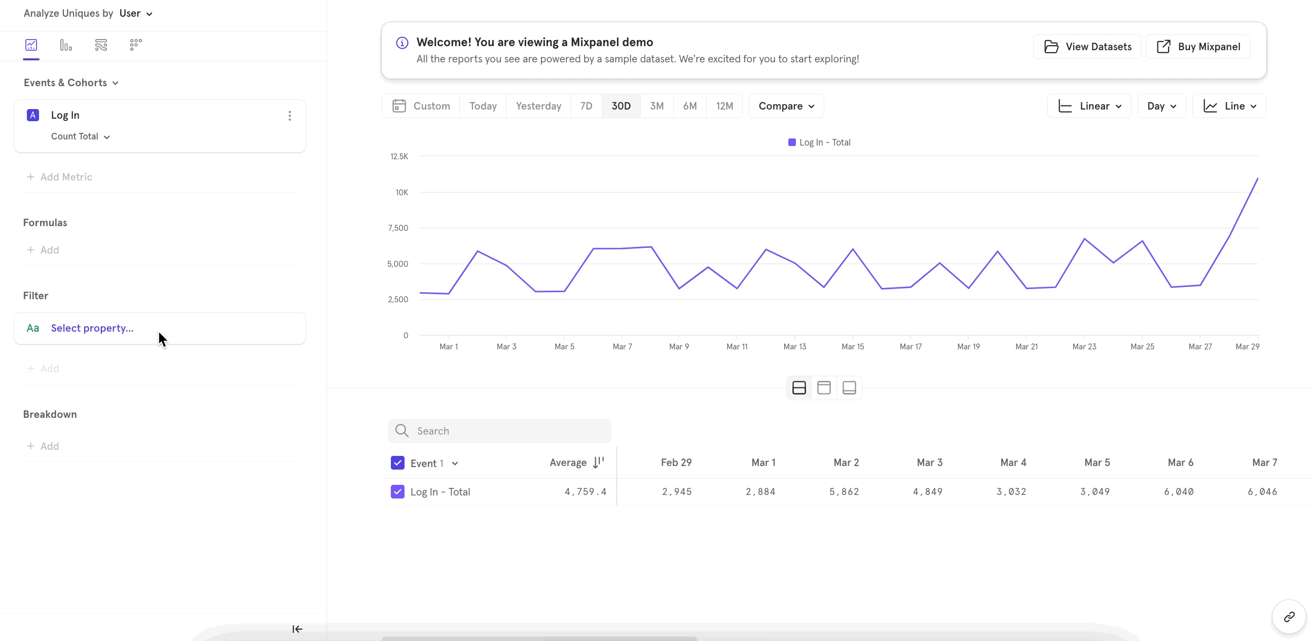 Insights: All event types and properties are available in Insights to break down and filter data.