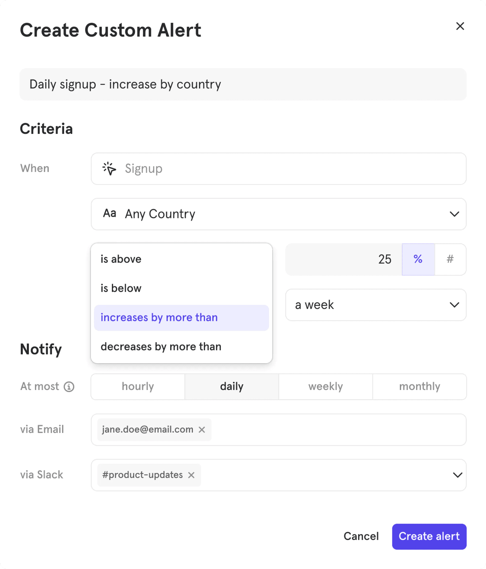 Create an alert for your Insights and Funnels reports and be notified when report conditions reach certain thresholds. Alerts are sent as an email or Slack message and can be sent to multiple users. To create an alert follow these steps: