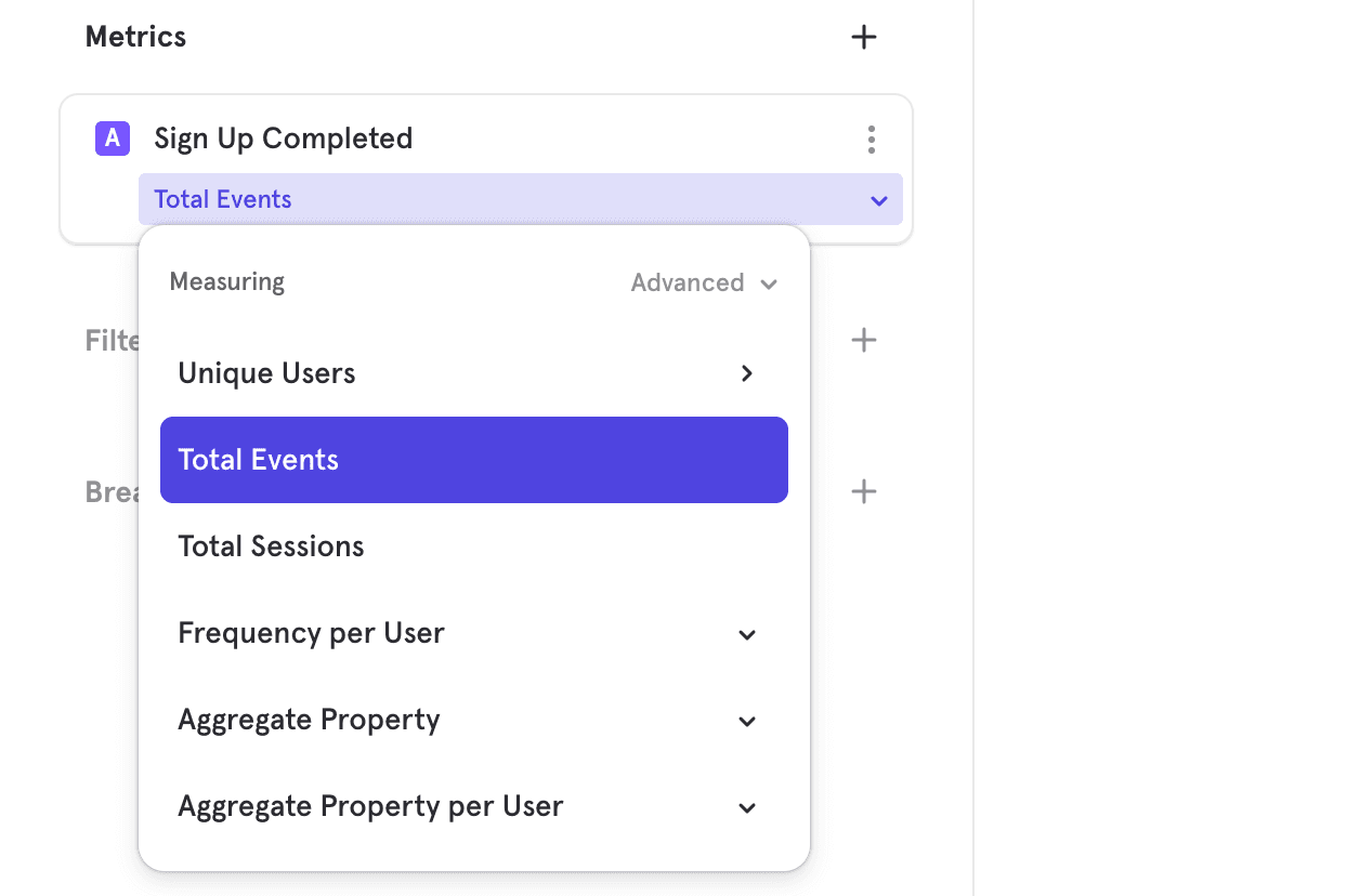 A measurement is a selection on how to summarize behaviors. Depending on the behavior, certain measurements may be not be possible. For example, for a single event, you cannot measure the conversion rate of it. Some examples of measurements are: total events, unique users, total sessions, conversion rate, retention rate and aggregate property. The measurement is chosen at the bottom left area of the metric.